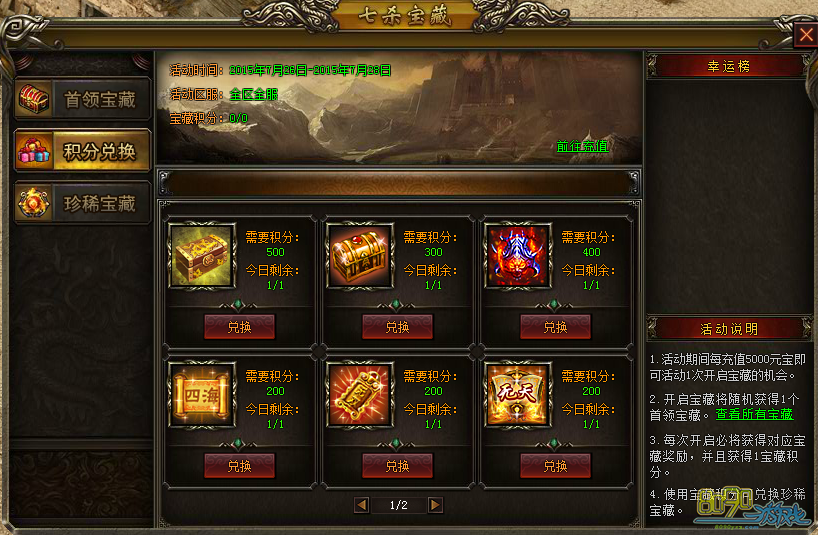 1. 活动期间每充值5000元宝即可活动1次开启宝藏的机会。