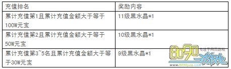 活动说明:活动期间,本服累计充值排名前5名便可获得丰厚奖励!排名第1更可获得11级黑水晶的奖励!累积充值300000元宝即可参与排名!活动结束后,奖励通过邮件发放! 活动奖励:9-11级黑水晶
