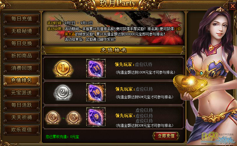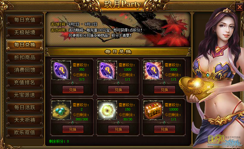 活动说明:活动期间,每充值100元宝,获得获得1点积分!可使用积分兑换多种物品!每日积分不清