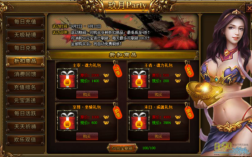 活动说明:活动期间,可购买多种折扣商品,最低低至4折!可消耗50元宝进行刷新,每天最多可刷新100次!全部购买后,将自动免费刷新!