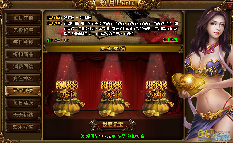 活动说明:活动期间,每天累计充值达到9999、49999、99999、499999,即可获得一次抽奖机会。每次抽奖需要消耗数量不等的元宝,抽奖成功即可获得三大元宝奖励之一。抽奖次数每天24:00点重