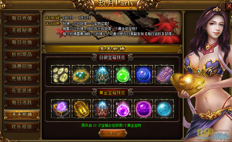 活动说明:祈祷一次可获得一个宝物奖励!每整10次祈祷,则可百分百获得一个黄金级宝物!每次祈祷需要消耗1个祈祷令,可通过参与日常副本和每日活跃获得!