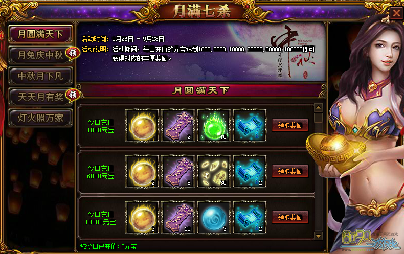 活动说明:活动期间,只要累积充值达到188815元宝,即可领取一个 迷情秋月!