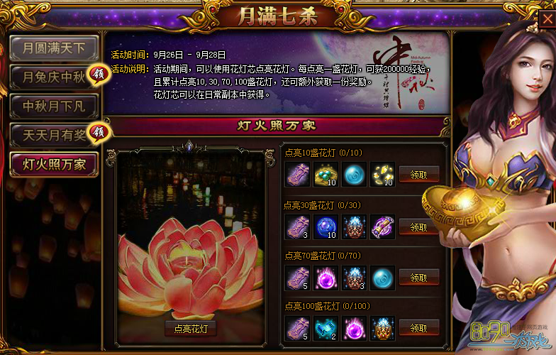 活动说明:活动期间,可以使用花灯芯点亮花灯,每点亮一盏,可获得200000经验,且累积点亮10,30,70,100盏花灯,还可额外获取一份奖励。花灯芯可以在日常副本中获得。