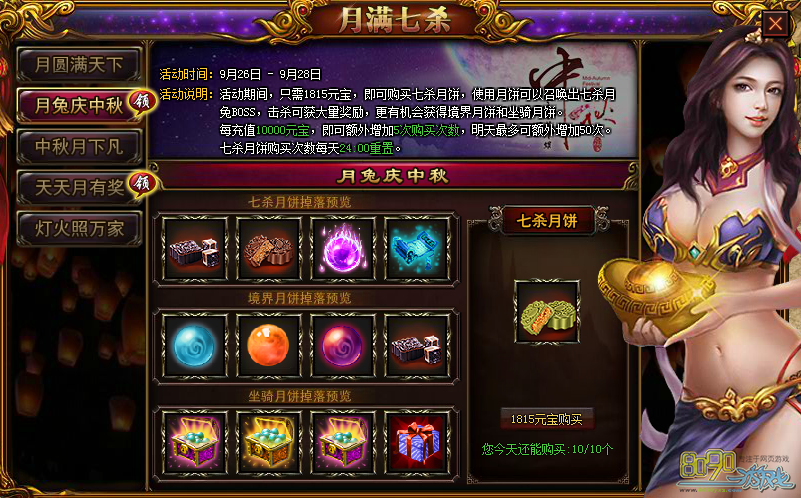 活动说明:活动期间,只需1815元宝,即可购买七杀月饼,使用月饼可以召唤出七杀月兔boss,击杀可获得大量奖励,更有机会获得境界月饼和坐骑月饼。