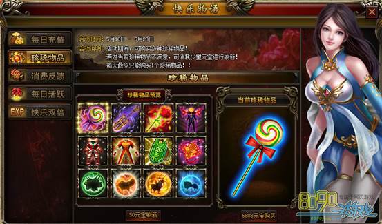 【活动说明】:活动期间,可购买多种珍稀物品!若对当前珍稀物品不满意,可消耗少量元宝进行刷新!每天最多只能购买1个珍稀物品
