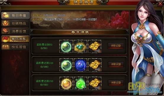 【活动说明】:每日活跃达到50、100、150、即可获得一份奖励!