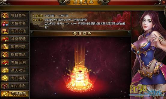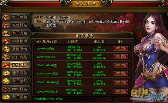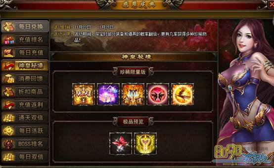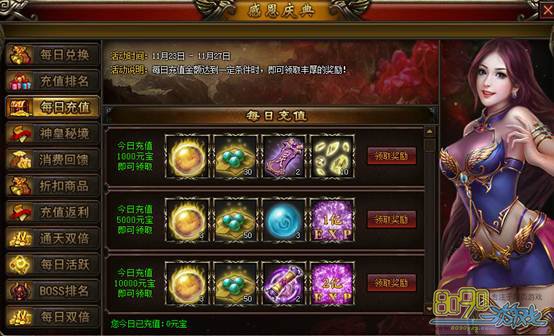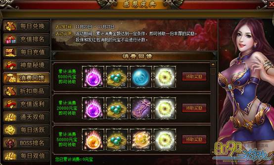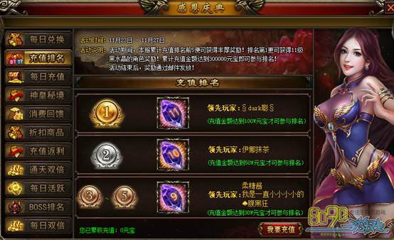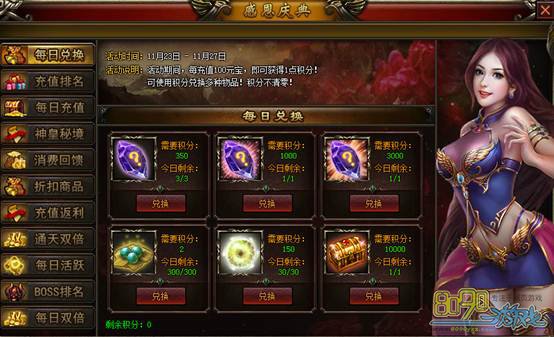 【活动说明】:活动期间,每充值100元宝,即可获得1点积分!可使用积分兑换多种物品!积分不清零!