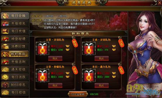 【活动说明】:活动期间,可购买多种折扣商品,全场最低低至4折!可消耗50元宝进行刷新,每天最多可刷新100次!全部购买后,将自动免费刷新!