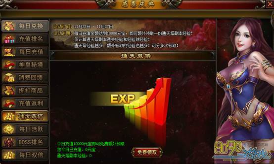 【活动说明】:每日充值金额达到10000元宝,即可额外领取一份通天塔副本经验!仅计算通天塔副本通关经验和经验球经验!通天塔经验越多,额外领取的经验也越多!可分多次领取!