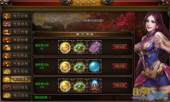 【活动时间】:当活跃度达到50、100、150后,可获得相对应的奖励!