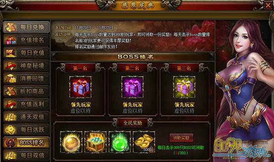 【活动内容】:每天击杀boss数量达到300的玩家,即可领取一份奖励;每天击杀boss数量排名前3的玩家更可获得丰厚奖励!排名奖励通过邮件发放!