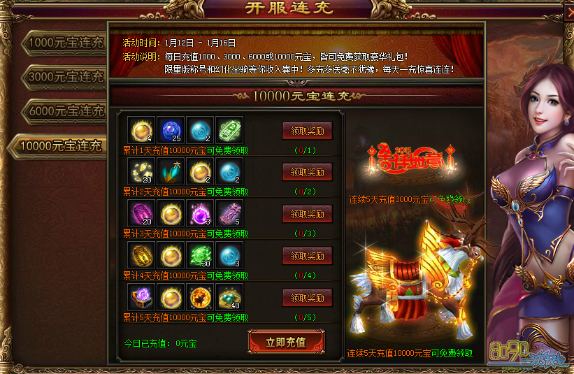 活动时间:开服前5天 活动内容:每日充值1000、3000、6000、10000,皆可免费获取豪华礼包!限量版称号和幻化坐骑等你收入囊中!多充多送毫无犹豫,每天一充惊喜连连!