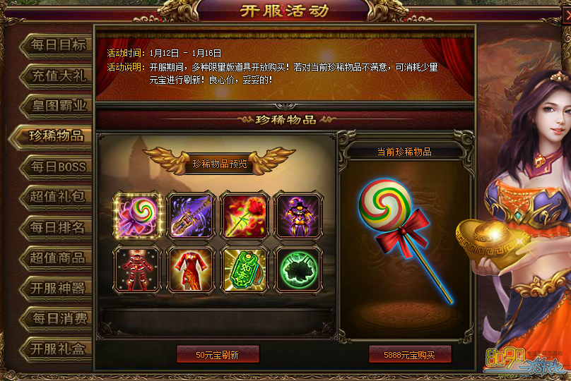 活动时间:开服前5天 活动内容:开服期间,多种限量本道具开放购买!若对当前珍稀物品不满意,可消耗少量元宝进行刷新!良心价,妥妥的!各类天兵、时装、称号和坐骑等你收入囊中!