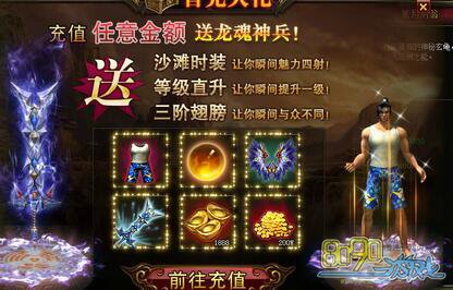 等级直升丹、沙滩时装、屠兽羽翼(3档)、龙魂震天斩、1888绑定元宝、200万绑定金币,这些奖励都是可以领取到的哦!