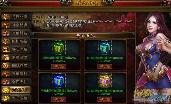 【活动说明】:活动期间,每天击杀怪物获得的符文值达到50000、100000、200000、300000时,即可获得大量的符文值奖励!