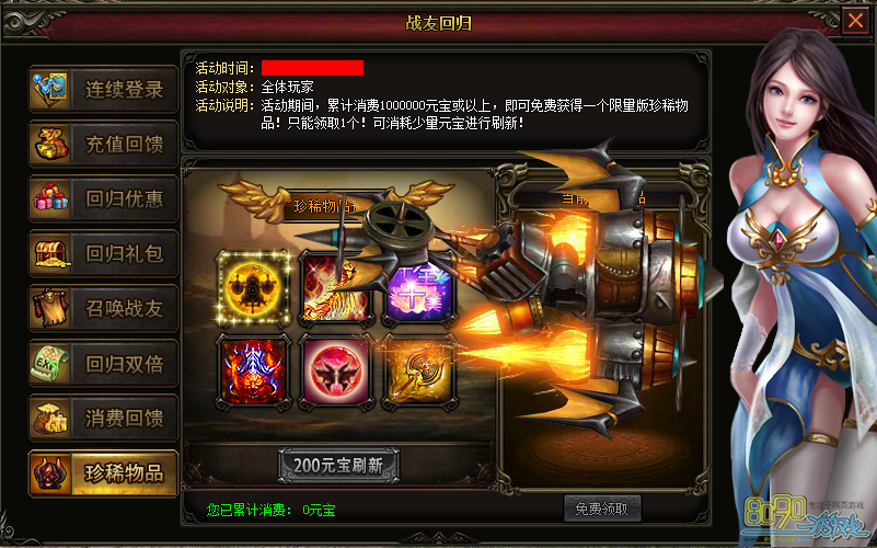 【活动说明】:活动期间,累计消费1000000或者以上,即可免费获得一个限量版珍稀物品!只能领取一个!可消耗少量元宝进行刷新!