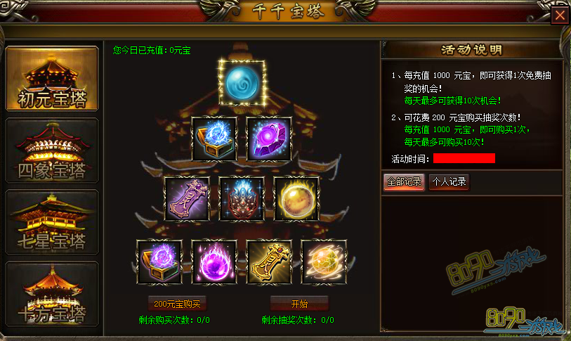 2、可花费200元宝购买抽奖次数! 每充值1000元宝,即可购买1次,每天最多可购买10次!
