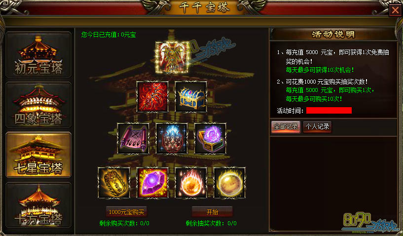 2、可花费1000元宝购买抽奖次数! 每充值5000元宝,即可购买1次,每天最多可购买10次!