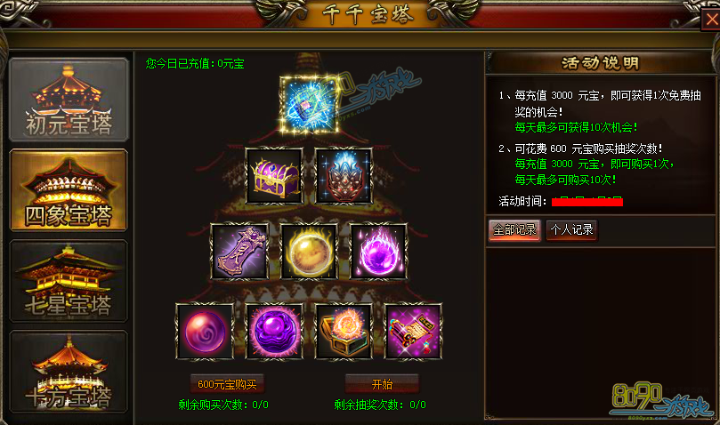 2、可花费2000元宝购买抽奖次数! 每充值10000元宝,即可购买1次,每天最多可购买10次!