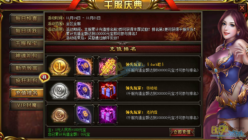 活动说明: 活动期间,本服累计充值排名前3名便可获得丰厚奖励!排名第1更可获得千服天兵!累积充值100000元宝即可参与排名!