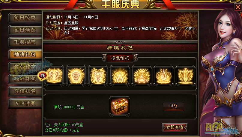 活动说明:活动期间,累积充值达到100W元宝,即可领取1个橙魂宝箱,让你君临天下,笑傲七杀!