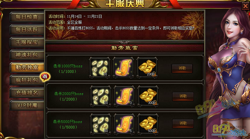 活动说明:千锤百炼打BOSS,活动期间,击杀boss数量达到一定条件,即可领取相应奖励!