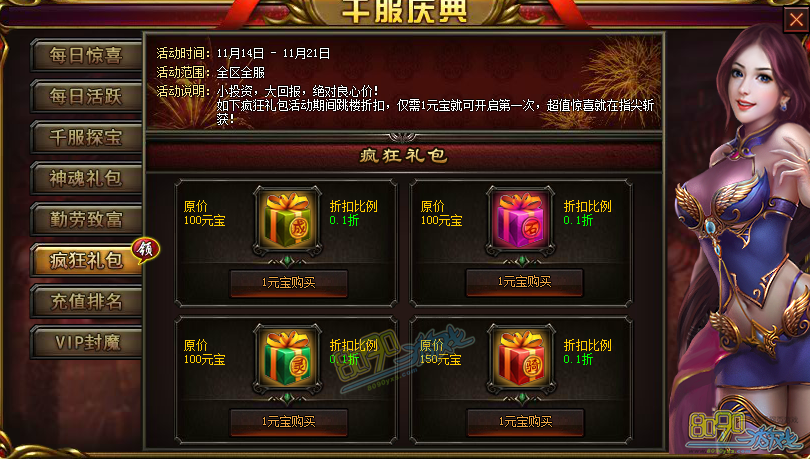 如下礼包活动期间跳楼折扣,仅需1元宝就可开启第一次,超值惊喜就在指尖斩获!