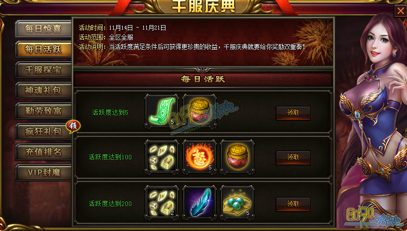 活动说明:当活跃度满足条件后可获得更珍贵的收益,千服庆典就要给你奖励双重奏!