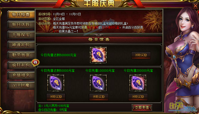 活动说明:每天充值满足条件即可领取百炼精钢礼盒和超级精钢礼盒;