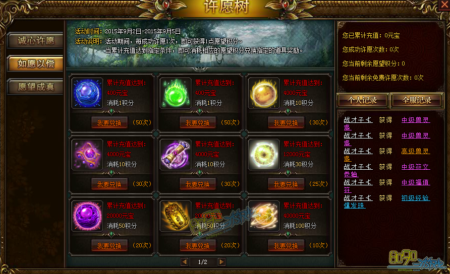 活动说明:活动期间,每累计充值2000元宝,即可获得1次免费许愿次数!同时您也可以花费元宝直接进行许愿,许愿优先消费免费许愿次数!成功许愿1次,即可获得1点许愿积分,积分可在【如愿以偿】处兑换极品奖励!