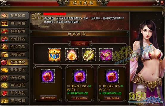 【活动说明】:活动期间,可购买超值的惊喜魔盒,达到一定条件后,更可享受折扣福利!使用魔盒,可获得多种超值奖励!