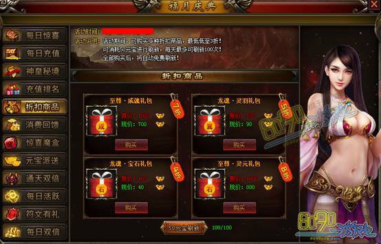 【活动说明】:活动期间,可购买多种折扣商品,全场最低低至4折!可消耗50元宝进行刷新,每天最多可刷新100次!全部购买后,将自动免费刷新!
