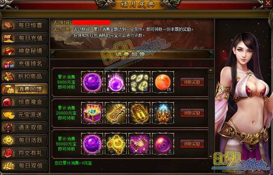 【活动说明】:活动期间,累积消费金额达到一定条件,即可领取一份丰厚的奖励!投保和发红包消耗的元宝不会进行计数。