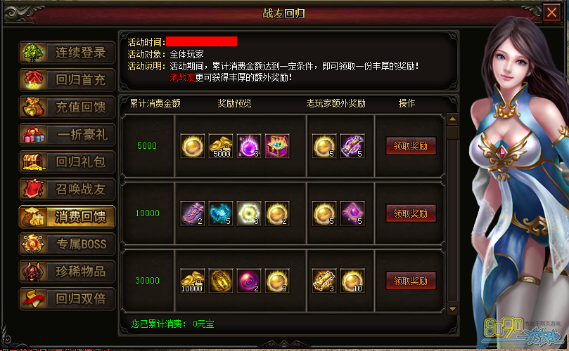 【活动说明】:活动期间,累计消费1000000或者以上,即可免费获得一个限量版珍稀物品!只能领取一个!可消耗少量元宝进行刷新!