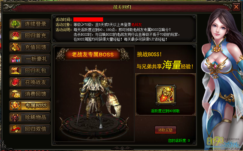 【活动说明】:每天活跃度达到90、180点,即可领取老战友专属BOSS召唤令!击杀BOSS时,与召唤BOSS的老战友同行会且等级不低于70级的玩家,在BOSS周围均可获得大量经验!每天最多可获得5次该经验!