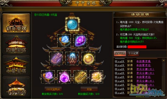 1、每充值1000元宝,即可获得1次免费抽奖的机会! 每天最多可获得10次机会!