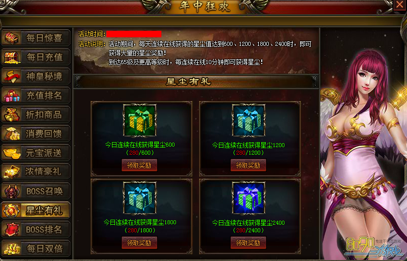 【活动说明】:活动期间,每天连续在线获得的星尘值达到600、1200、1800、2400时,即可获得大量的星尘奖励!到达65级及更高等级时,每连续在线10分钟即可获得星尘!
