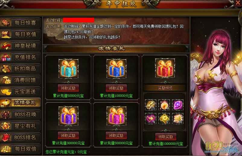 【活动说明】:活动期间,累积充值金额达到一定条件,即可每天免费领取回馈礼包!回馈礼包24:00刷新!越早达到条件,可领取的礼包越多!