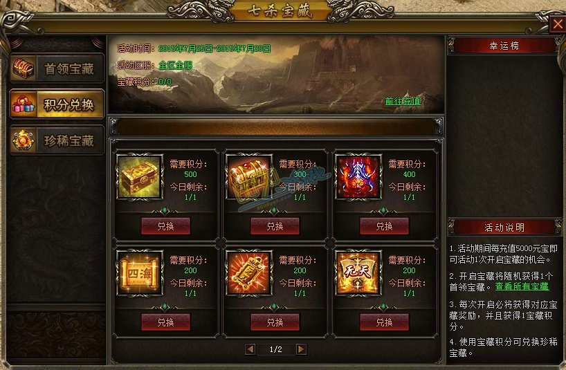 1. 活动期间每充值5000元宝即可活动1次开启宝藏的机会。