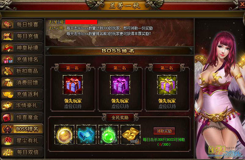 【活动说明】:每天击杀boss数量达到300的玩家,即可领取一份奖励每天击杀boss数量排名前3的玩家更可获得丰厚奖励!