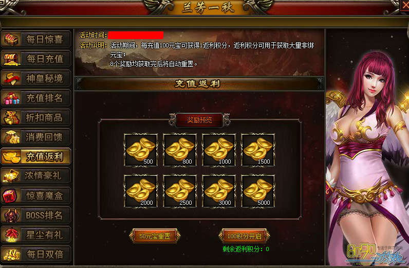 【活动说明】:活动期间,每充值100元宝可获得1返利积分,返利积分可以用于获得大量非绑定元宝;8个奖励均获取后完后将自动重置。