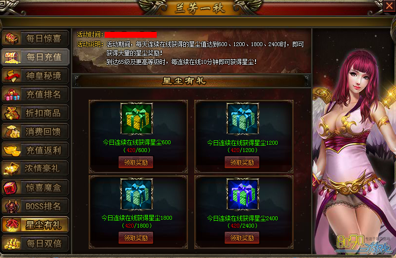 【活动说明】:每日充值金额达到一定条件时,可领取一份奖励。