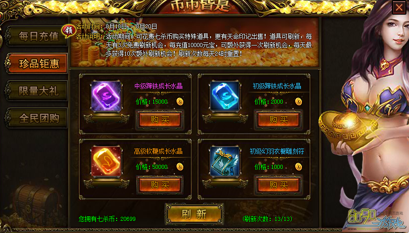 活动说明:活动期间,可花费七杀币购买特殊道具,更有天命印记出售!道具可刷新,每天有3次免费机会,每充值10000元宝,可额外获得一次刷新机会,每天最多获得10次额外刷新机会!刷新次数每天24小时重置。