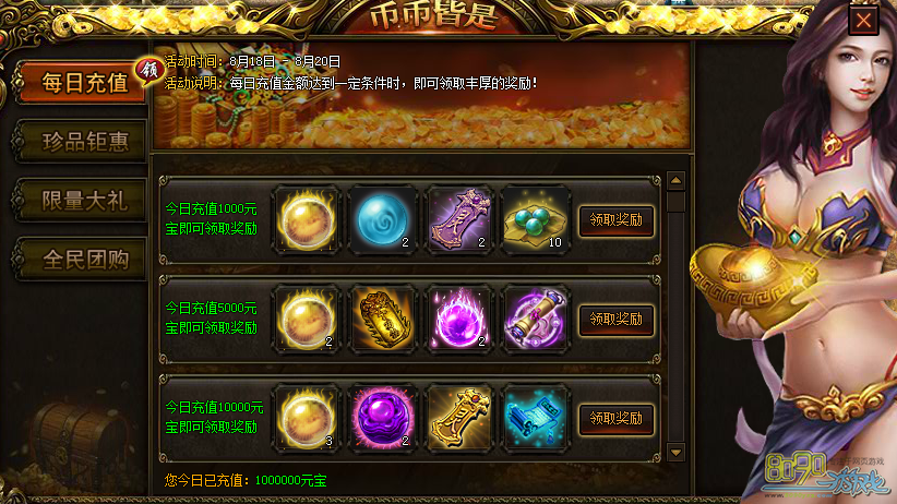 活动说明:每日充值金额达到一定条件时,可领取丰厚奖励