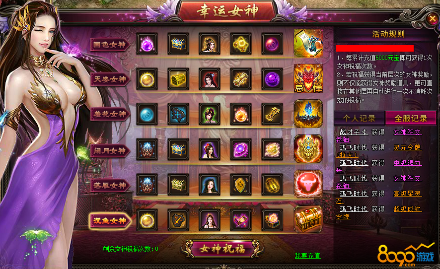 1、每累计充值5000元宝即可获得1次女神祝福次数。