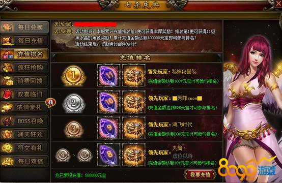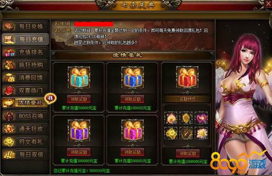 【活动说明】:每日充值达到88888、288888元宝,即可免费领取一个稀有道具!可花200元宝刷新!