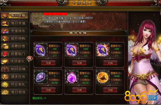 【活动说明】:活动期间,每充值100元宝,即可获得1点积分!可使用积分兑换多种物品!积分不清零!