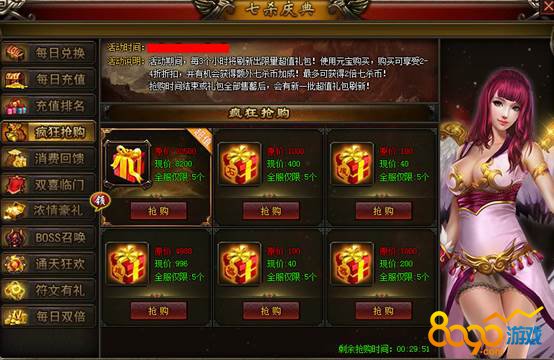 【活动说明】:活动期间,每3小时刷新出超值礼包!使用元宝购买,购买可享受2-4折折扣,并有机会获得七杀币加成!最多可获得2倍七杀币。抢购时间结束或全部售完,会有新一批超值礼包刷新!