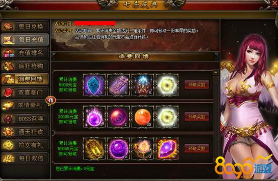 【活动说明】:活动期间,累积消费金额达到一定条件,即可领取一份丰厚的奖励!投保和发红包消耗的元宝不会进行计数。
